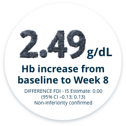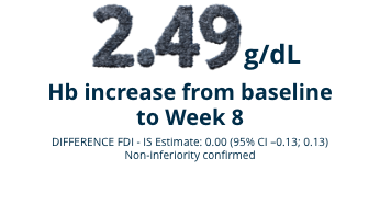 - More patients achieved an Hb increase ≥2 g/dL at Week 1 (5.3% n=960 vs 2.5% n=477) and Week 2 (32.6% n=912 vs 20.8% n=452) with Monoferric compared to iron sucrose